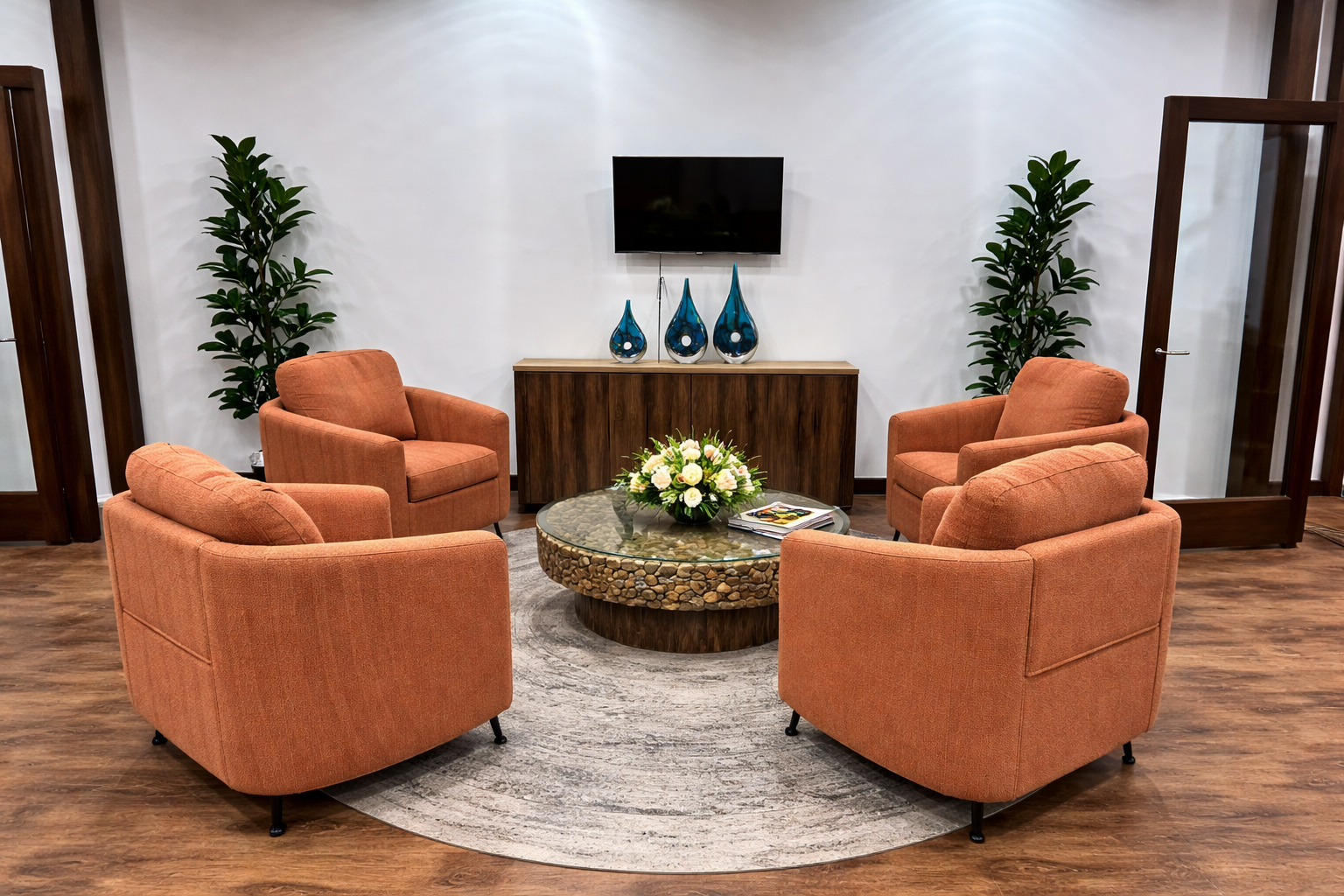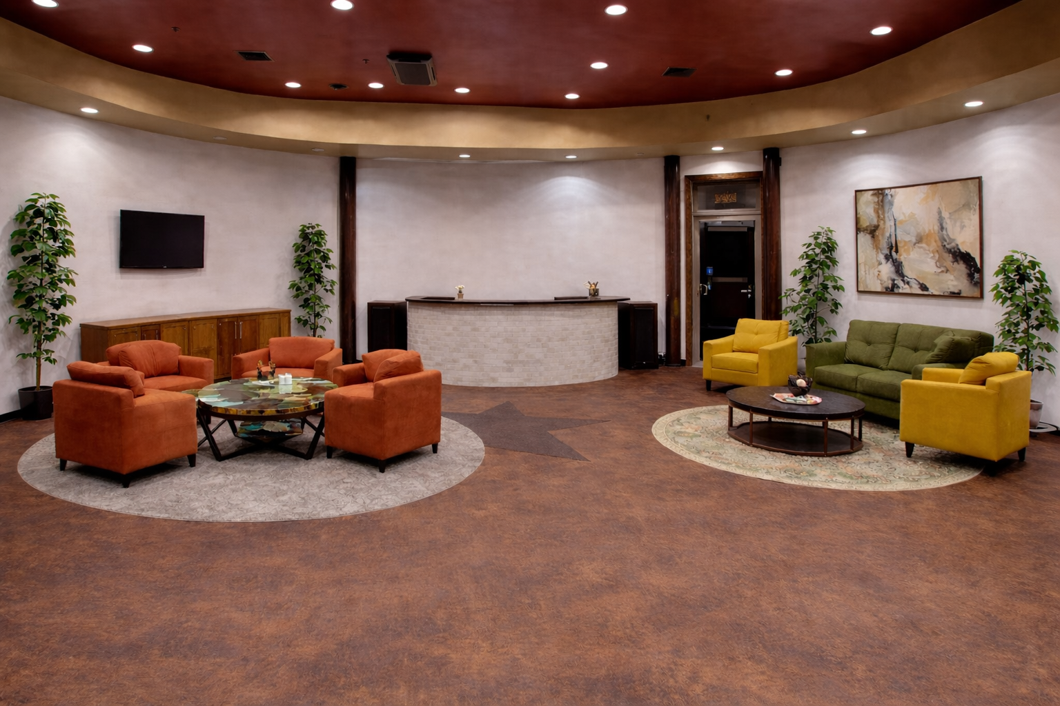 With curated seating arrangements, warm finishes, and an open, inviting layout, the lobby creates a space that feels both comfortable and elevated. Whether your clients arrive early or you need a place to connect informally, this space reflects professionalism at every touchpoint.